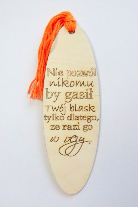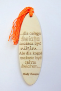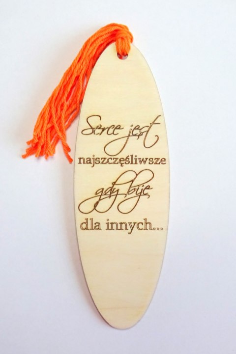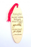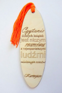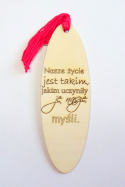 Drewniana zakładka z wygrawerowanym laserowo napisem i kolorowym sznurkiem bawełnianym.