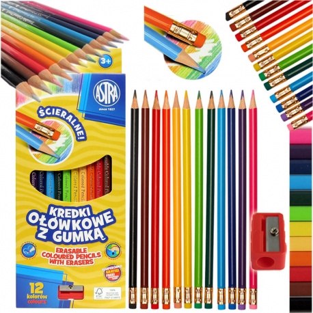 KREDKI OŁÓWKOWE Z GUMKĄ + TEMPERÓWKA, 12 KOLORÓW ASTRA