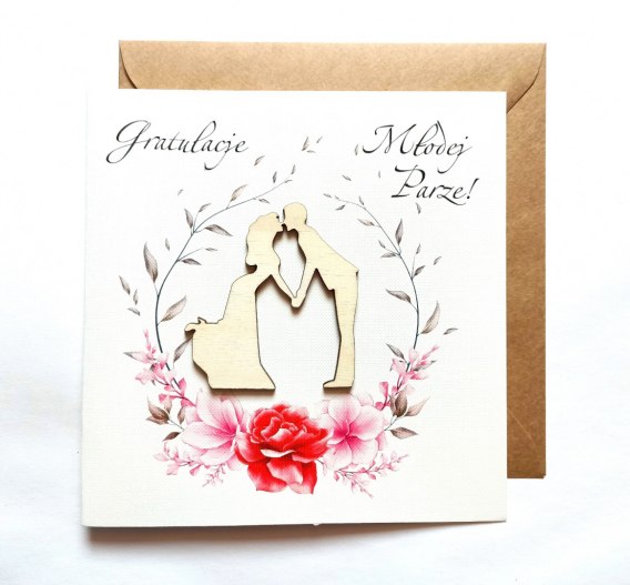 Kartka Ślubna wykonana ręcznie, w środku nadrukowane życzenia.
