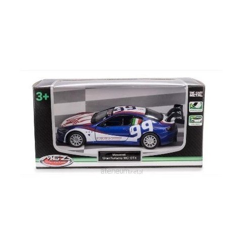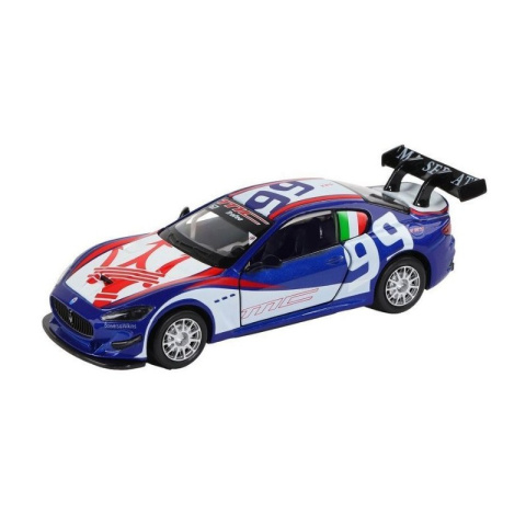 Sportowy Model Maserati Gran Turismo MC, wykonany z metalu i plastiku, w skali 1:43 w kolorze niebiesko-białym.