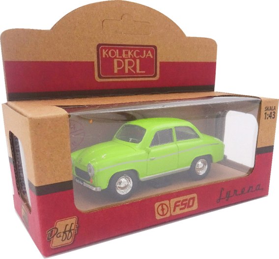 Idealnie odwzorowany model Syrena 104 w kolorze zielonym w skali 1:43. Wyprodukowany na licencji FSO. Karoseria jest wykonana z metalu, posiada elementy plastikowe i gumowe koła. Model w estetycznym, kartonowym opakowaniu typu window box, świetnie prezentującym się na półce każdego miłośnika modeli samochodów.