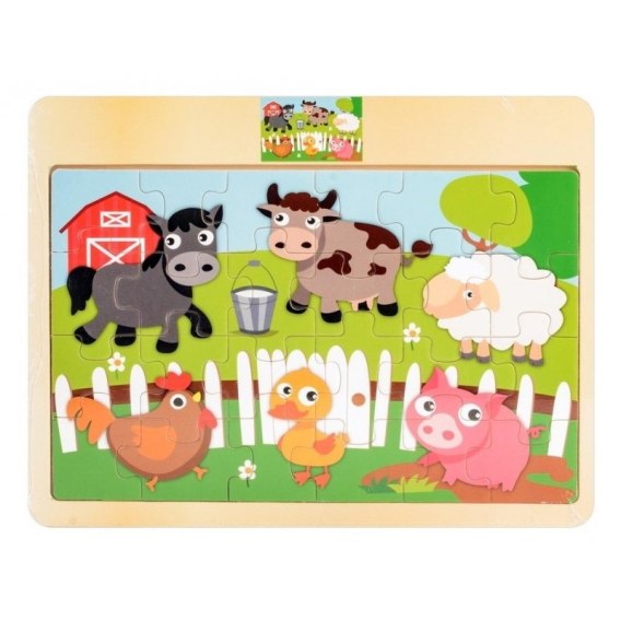 Układanka drewniana dla dzieci, rozwija spostrzegawczość, wyobraźnię i koordynację wzrokowo-ruchową. Puzzle składają się z 24 elementów z poglądowym obrazkiem.